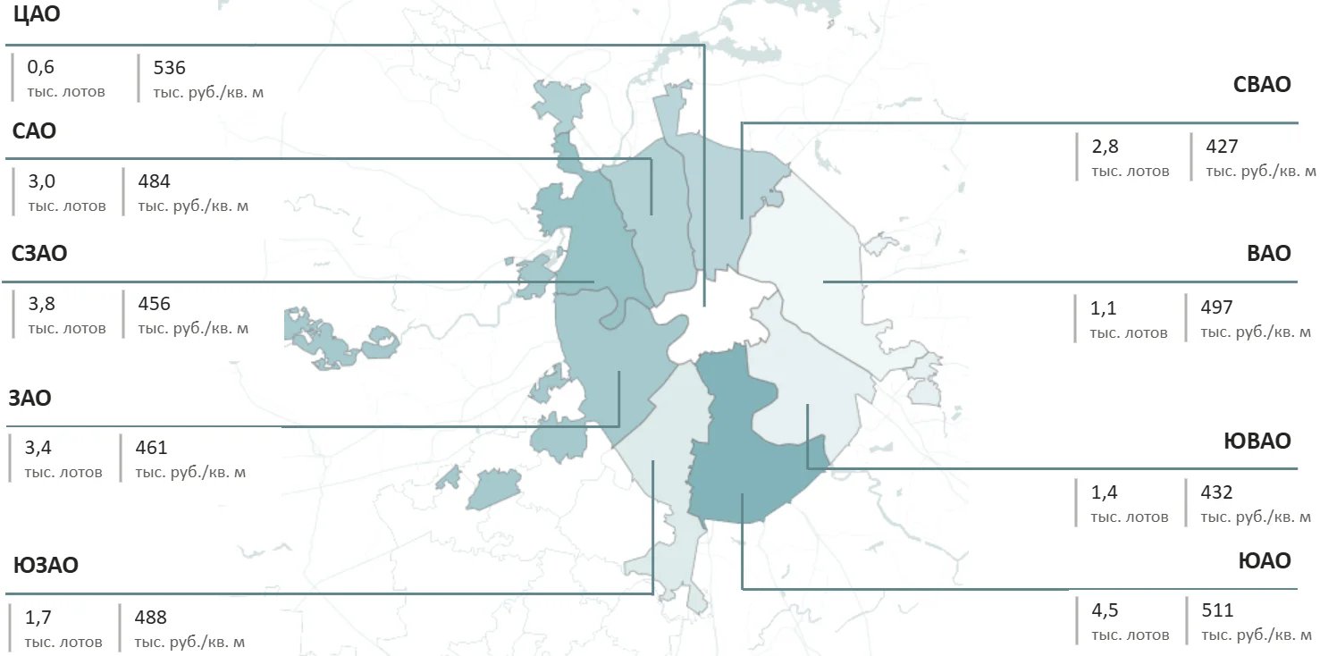 Среди округов лидерство по объему предложения сохраняет ЮАО. Здесь реализуются такие масштабные проекты как Wave, Shagal и «ЗИЛАРТ» Сильнее всего за квартал цена кв. метра выросла в ЦАО (536 тыс. руб./кв. метр, +7% за квартал). Объем предложения сократился в 6 округах из 9 за исключением ВАО (1,1 тыс. лотов, +13% за квартал), СВАО (2,8 тыс. лотов, +7% за квартал) и СЗАО (3,8 тыс. лотов, +6% за квартал).
