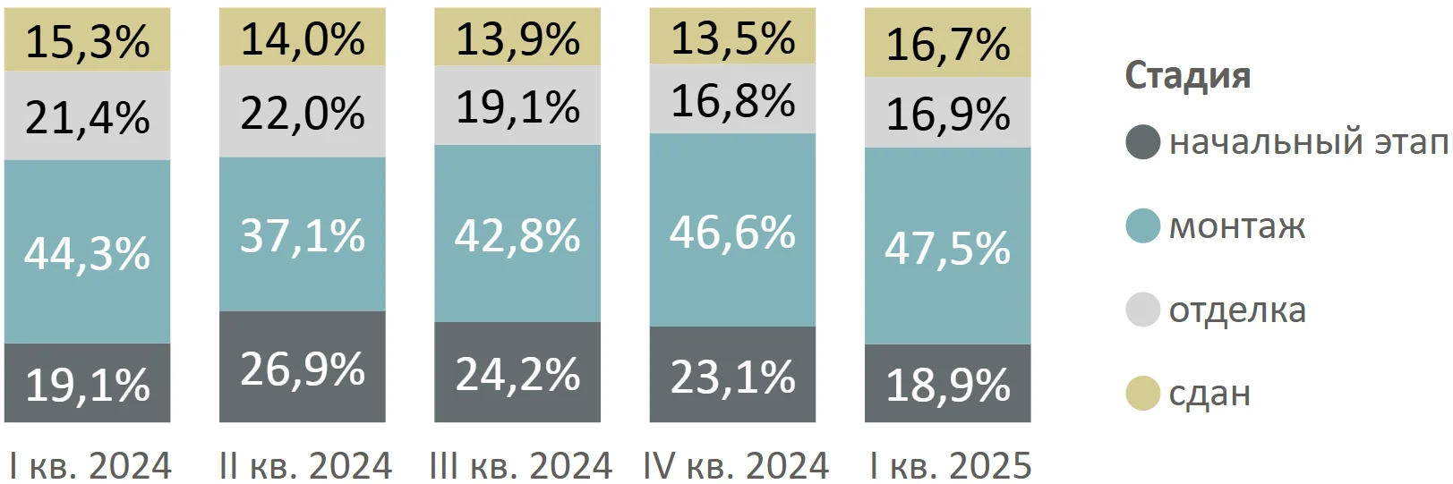 На фоне сокращения темпов вывода новых проектов доля предложения в корпусах на начальной стадии строительства снизилась до 18,9% (-4,2 п.п. за квартал). Из-за уменьшения объема предложения на стадии котлована выросла доля предложения на более поздних этапах строительства. Однако, в отличие от котлована, абсолютный объем предложения на этих этапах существенно не изменился.