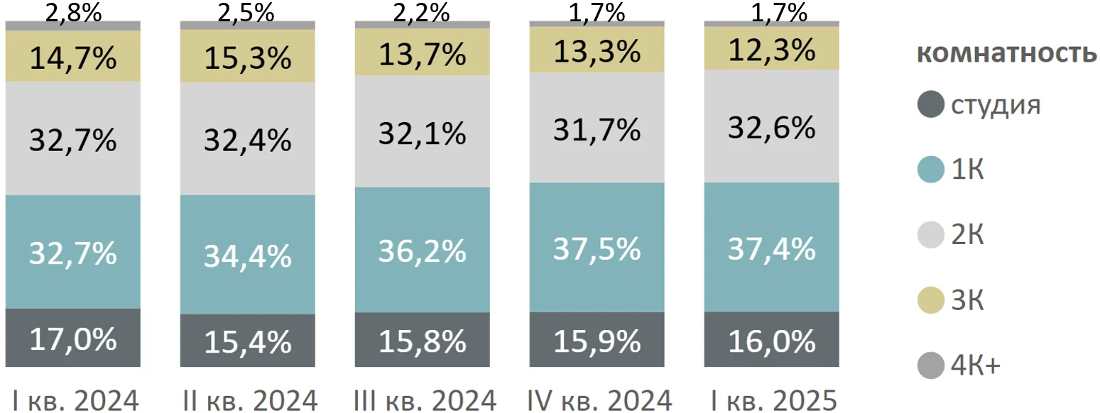 В распределении предложения по типологии за квартал выросла доля двухкомнатных лотов (32,6%, +0,9 п.п. за квартал) и сократилась доля трехкомнатных форматов (12,6%, -1,0 п.п. за квартал). Доля студий и однокомнатных квартир и апартаментов практически не изменилась.