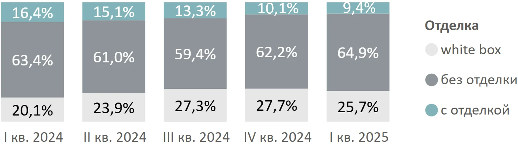 В структуре предложения по типу отделки сохраняется тенденция к росту доли предложения без отделки (64,9%, +2,7 п.п. за квартал), причем объем предложения без отделки за квартал не изменился (14,4 тыс. лотов, без изменений за квартал), а рост доли произошел за счет вымывания форматов с чистовой отделкой (5,7 тыс. лотов, -10,9% за квартал.) и отделкой white box (2,1 тыс. лотов, -10,8% за квартал).
