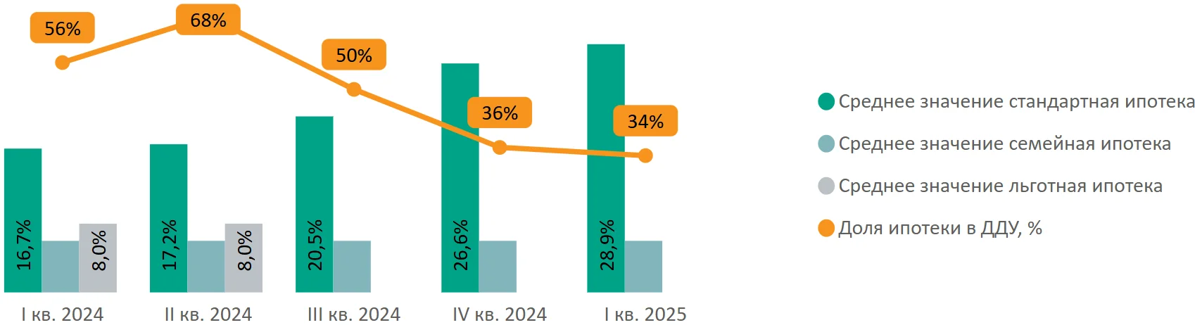 Доля сделок с привлечением ипотечного кредита в I квартале составила 34% (-2 п.п. за квартал, -22% за год). Средняя ставка по рыночной ипотеке за квартал выросла на 2,3 п.п. до 28,9%.