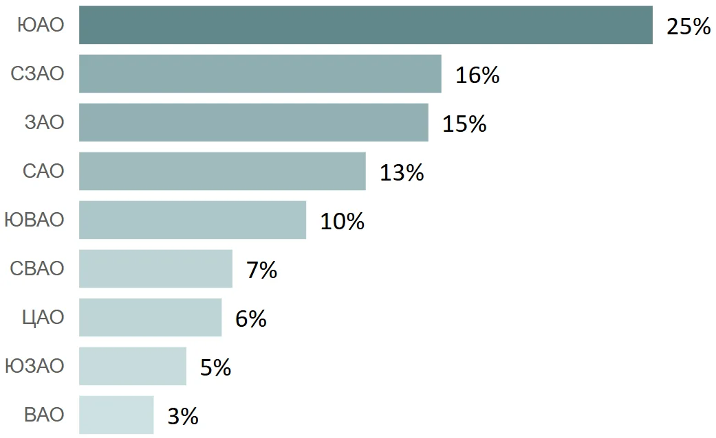 В I квартале максимальное число сделок было зарегистрировано в ЮАО (25%, +3 п.п. за квартал), где по числу сделок лидируют ЗИЛАРТ (346 ДДУ) и Shagal (283 ДДУ). Второе место по числу сделок приходится на СЗАО (16%, +1 п.п. за квартал), третью позицию занимает ЗАО (15%, -2 п.п. за квартал).