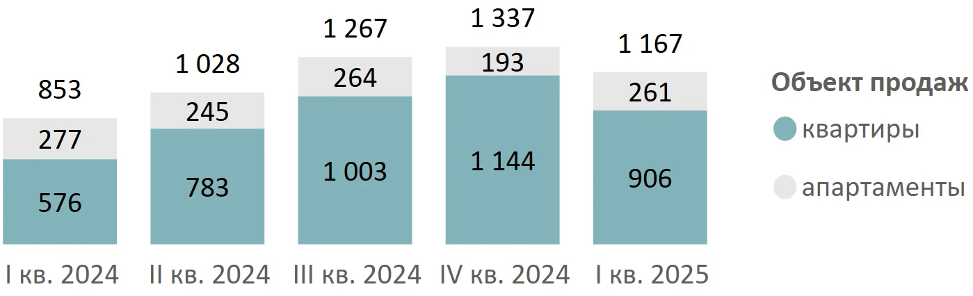 В I квартале 2025 года на рынке новостроек высокобюджетного сегмента было зарегистрировано 206 ДДУ (-29,9% за квартал, +116,8% за год) общей площадью 25 812 кв. метров (-28,3% за квартал, +95,1% за год). Максимальное число сделок было заключено в феврале (96 ДДУ), минимальное – в январе (41 ДДУ).