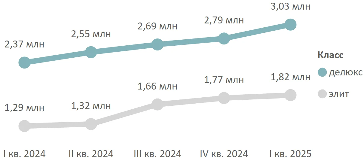 По подсчетам аналитиков «Метриум», средневзвешенная цена квадратного метра квартир и апартаментов по итогам I квартала 2025 года составила 2,33 млн рублей (+9,5% за квартал, +28,9% за год). Средневзвешенная цена элитного класса – 1,82 рублей за кв. метр (+2,8% за квартал, +41,2% за год), делюкс-класса – 3,03 руб. за кв. метр (+8,6% за квартал, 27,5% за год).