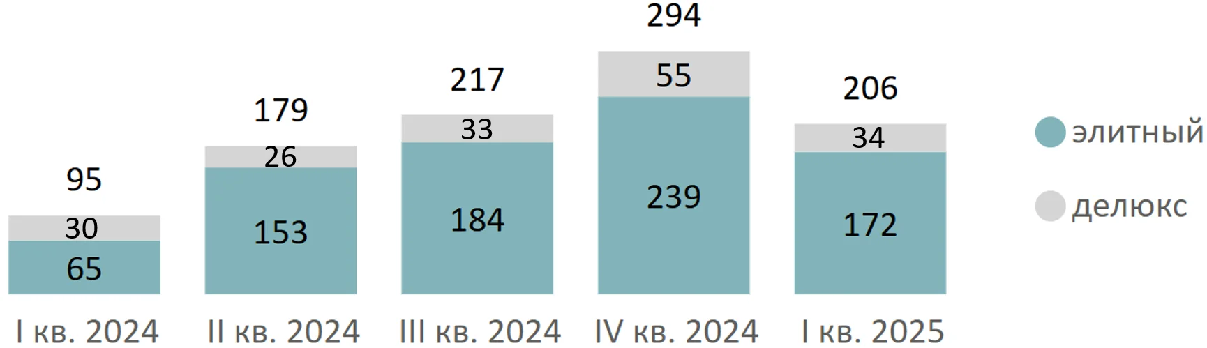 В I квартале 2025 года на рынке новостроек высокобюджетного сегмента экспонировалось 1,87 тыс. лотов (-3,2% за квартал, +32,1% за год) в 66 проектах, где 1,5 тыс. – квартиры и 0,36 тыс. – апартаменты (-10,9% за квартал, -24,4% за год). Объем предложения в делюкс-классе за квартал вырос на 18,5% и составил 0,7 тыс. В элитном классе за квартал объем предложения сократился на 12,7% и составил 1,17 тыс. лотов.