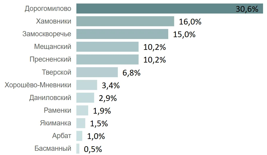 В I квартале 2025 года максимальное число сделок было отмечено в районе Дорогомилово (30,6%). Здесь по площади заключенных ДДУ лидируют Бадаевский (4,5 тыс. кв. м) и Victory Park Residence (2,2 тыс. кв. м).