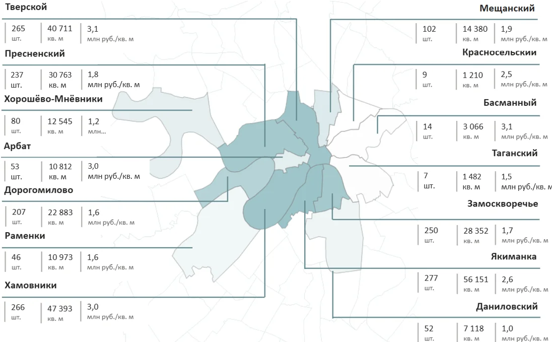 Максимальный объем предложения представлен в районе Якиманка (277 лотов, 56,1 тыс. кв. метров). Здесь реализуются такие проекты как «Лаврушинский», CULT, DUO, «Резиденция 1864».