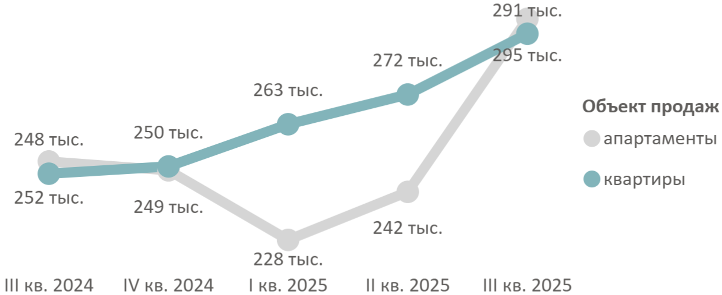 По подсчетам аналитиков «Метриум», средневзвешенная цена квадратного метра квартир и апартаментов по итогам III квартала 2025 года составила 290 640 рублей (+7% за квартал, +17% за год). Средневзвешенная цена квартир – 290 560 руб. за кв. метр (+7% за квартал, +17% за год), апартаментов – 295 120 руб. за кв. метр (+22% за квартал, +17% за год).