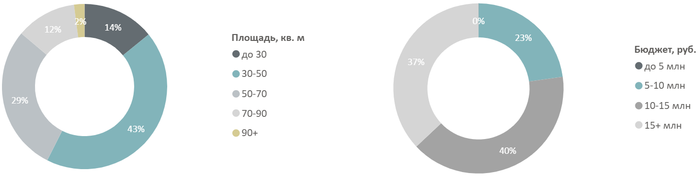 Распределение предложений на первичном рынке недвижимости Новой Москвы по площадям и бюджетам, количество лотов