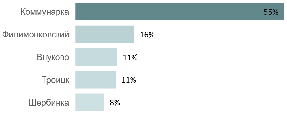 Среди районов максимальное число сделок было зарегистрировано в Коммунарке (55%, -4 п.п. за квартал).