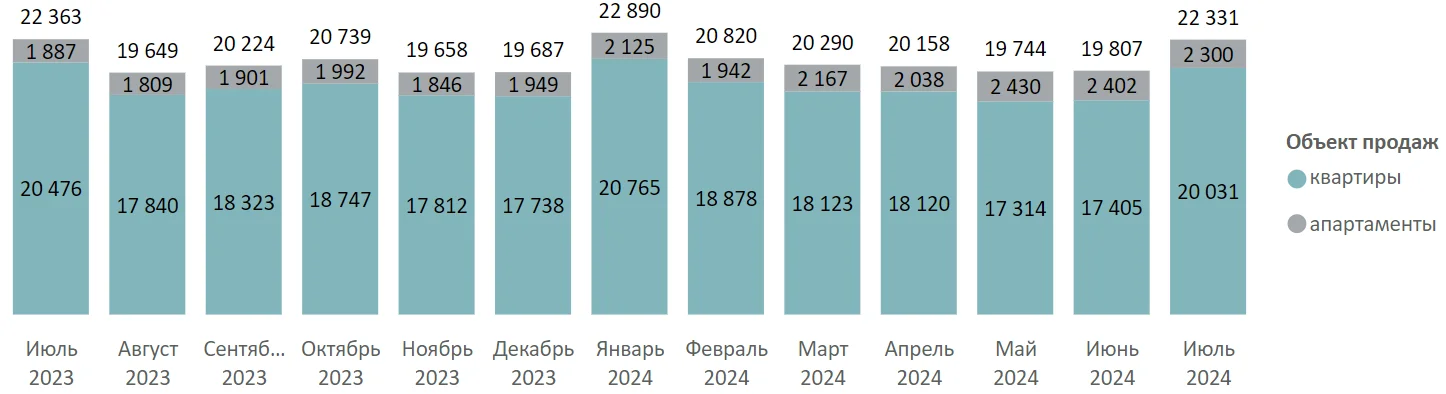 В июле 2024 года на рынке новостроек массового сегмента экспонировалось 22,3 тыс. лотов (+12,7% за месяц, без изменений за год), где 20 тыс. – квартиры (+15% за месяц, -2% за год) и 2,3 тыс. – апартаменты (-4% за месяц, +22% за год).