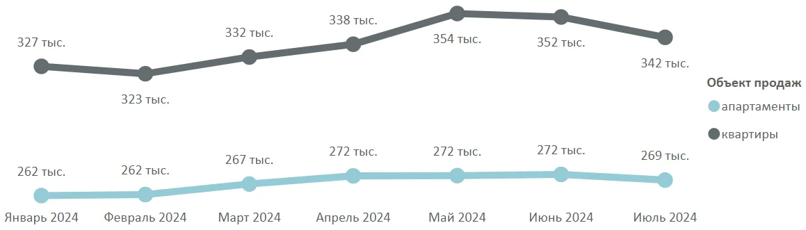 По подсчетам аналитиков «Метриум», средневзвешенная цена квадратного метра квартир и апартаментов по итогам июля 2024 года составила 335 320 руб. (-2,5% за месяц, +5,3% за полгода, +12% за год). Средневзвешенная цена квартир составила 341 760 руб. за кв. м (-2,9% за месяц, +12% за год), апартаментов – 269 470 руб. за кв. м (-1% за месяц, +7% за год).