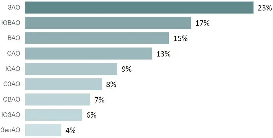 Максимальная доля спроса в июле была отмечена в ЗАО, где самое большое число сделок зарегистрировано в проекте «Лучи» (277 ДДУ в июле).