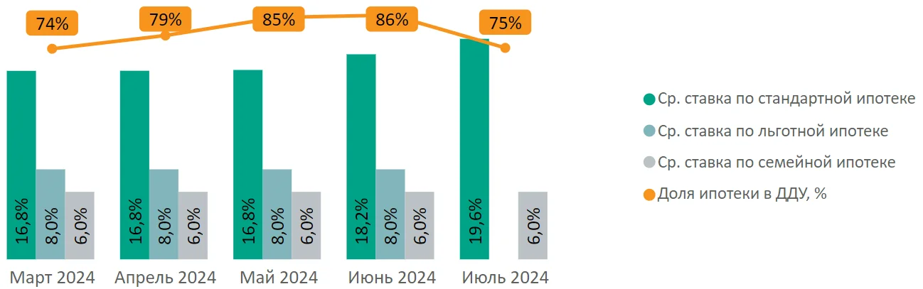 Доля сделок с ипотекой в июле сократилось до 75% (-11 п.п.).