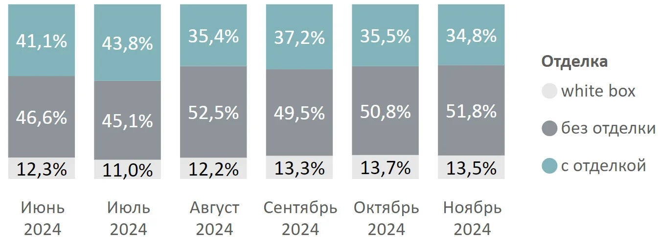 В ноябре 2024 года 51,8% квартир и апартаментов реализовывались без отделки (+1 п.п. за месяц), 34,8% с чистовой отделкой (-0,7 п.п. за месяц) и 13,5% с отделкой white box (-0,2 п.п. за месяц).