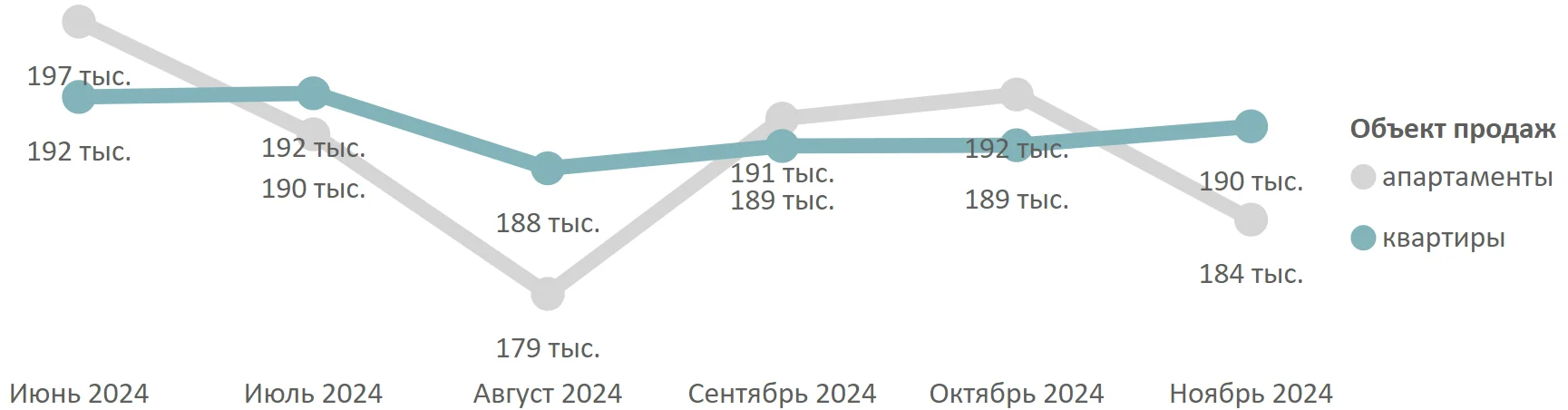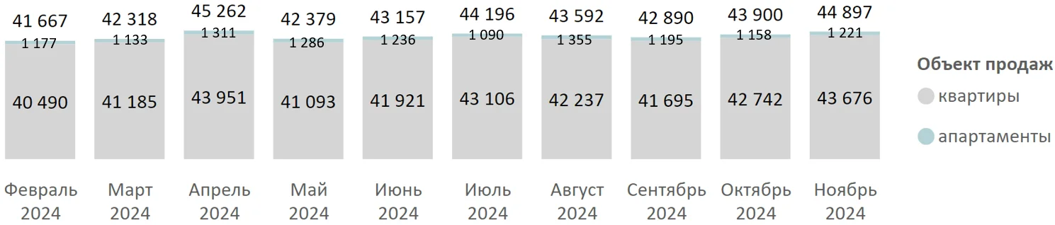 По подсчетам аналитиков «Метриум», средневзвешенная цена квадратного метра квартир и апартаментов по итогам ноября 2024 года составила 190 188 рублей. (+0,5% за месяц). Средневзвешенная цена квартир – 190 320 рублей за кв. метр (+0,7% за месяц), апартаментов – 184 250 рублей за кв. метр (-4,2% за месяц).