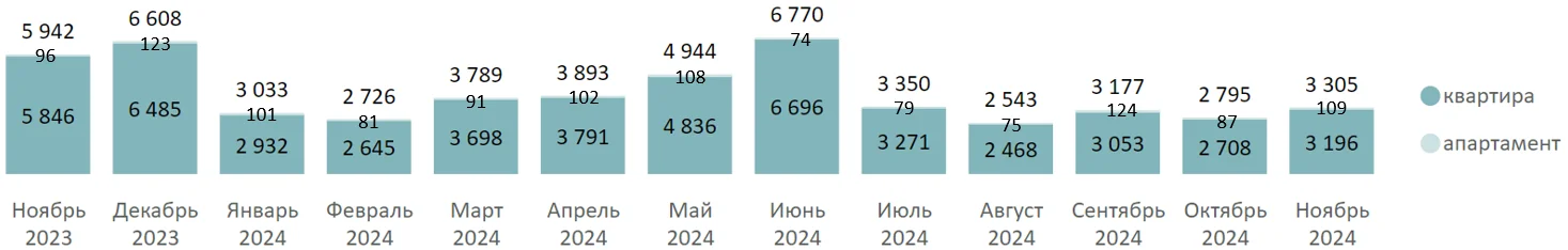 В ноябре 2024 года на рынке новостроек Московской области было зарегистрировано 3,3 тыс. ДДУ (+18,2% за месяц, -33,2% за полгода, -44,4% за год), с апартаментами было зарегистрировано 109 сделок, с квартирами – 3,2 тыс.