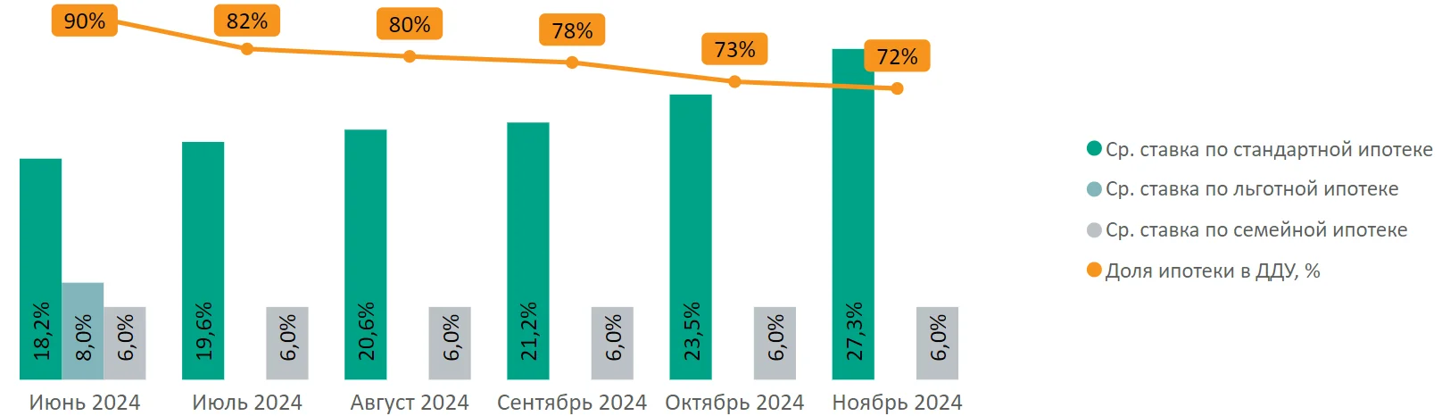 Доля сделок с привлечением ипотечного кредита в ноябре сократилась до 72% (-1 п.п. за месяц). Средняя ставка по рыночной ипотеке в ноябре выросла на 3,8 п.п. и составила 27,3%.