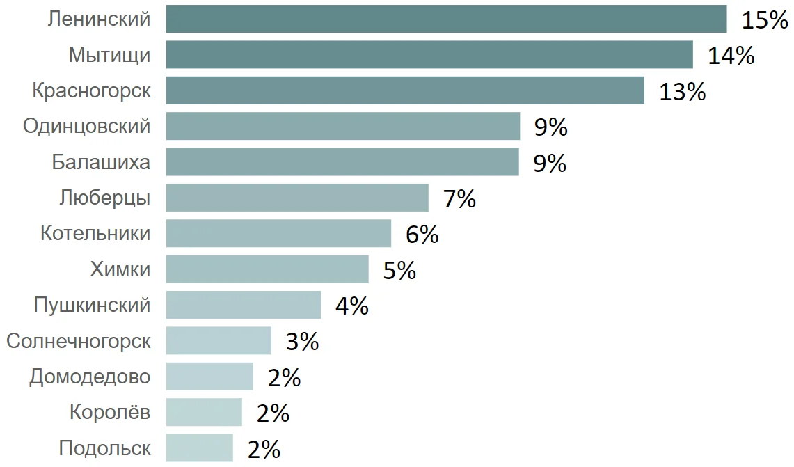 Среди округов по объему сделок в ноябре лидируют Ленинский г. о. (15%), Мытищи (14%) и Красногорск (13%), причем в Красногорске доля объема предложения составляет лишь 7%.