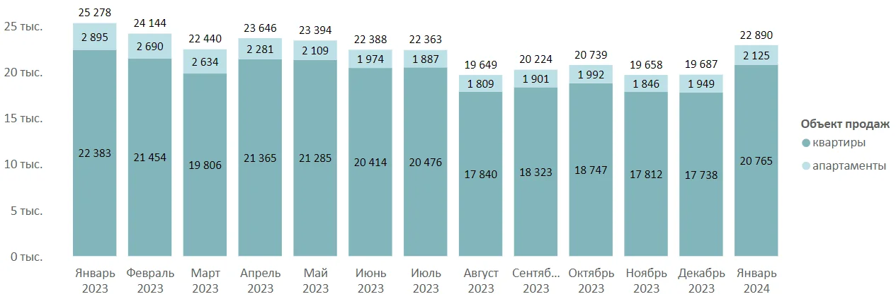 В январе 2024 года количество предлагаемых лотов на рынке массового сегмента достигло 22,9 тыс. лотов, из которых 20,8 тыс. – квартиры и 2,1 тыс. – апартаменты. Относительно прошлого месяца объем предложения вырос на 16,3%. В сравнении с январем прошлого года количество экпонируемых лотов на рынке сократилось на 9,4%.