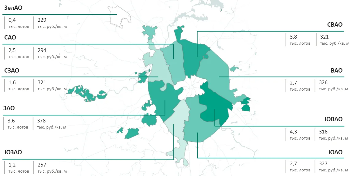 Среди округов ЮВАО сохраняет лидерство по объему предложения: здесь экспонируется 4,3 тыс. лотов (+13,2% за месяц). В ЗАО, где предлагаются самые дорогостоящие варианты, средняя стоимость квадратного метра составляет 378 тыс. руб. (-0,3% за месяц). Наиболее заметная динамика цены отмечена в СЗАО, где средняя стоимость кв. м. за месяц сократилась на 5,1%. По остальным округам динамика цены кв. м незначительна.