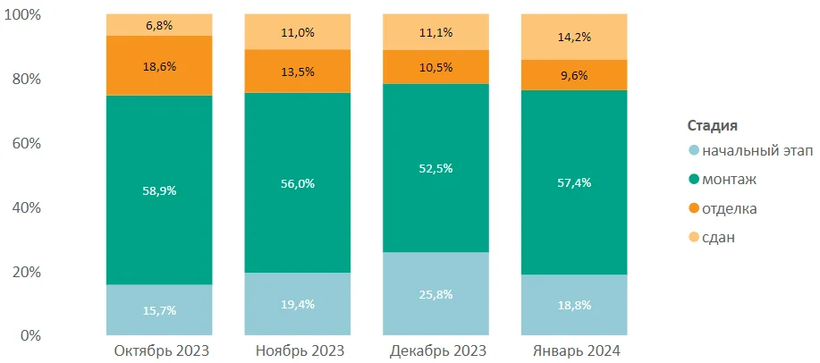 Максимальная доля предложений в январе сконцентрирована в корпусах на стадии монтажа этажей (57,4%, +4,9 п.п. за месяц). За месяц сократилась доля предложений в корпусах на начальной стади строительства (18,8%, -7 п.п. за месяц) и на стадии отделки (9,6%, -0,9 п.п.). Доля предложений в готовых корпусах составляет 14,2% рынка (+3,1 п.п. за месяц).