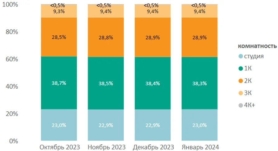 В разрезе комнатности структура предложения практически не изменилась. Наибольшая доля предложений стабильно приходится на однокомнатные форматы (38,3%, -0,1 п.п.).