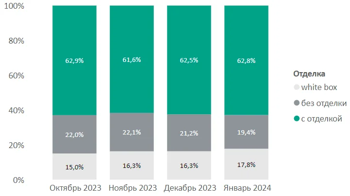 В январе увеличилась доля предложений с чистовой отделкой (62,8%, +0,3 п.п. за месяц) и с отделкой white box (17,8%, +1,5 п.п. за месяц). Доля предложений без отделки сократилась на 1,8 п.п. и составила 19,4%.