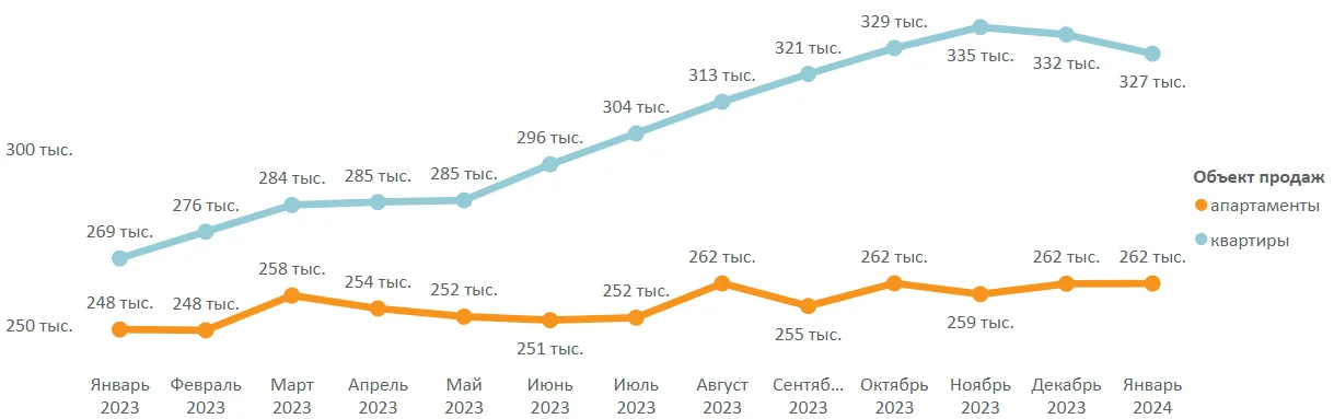 По подсчетам аналитиков «Метриум», средневзвешенная цена кв. метра квартир и апартаментов по итогам января 2024 года составила 321 830 руб. (-1,4% за месяц, +20,7% за год). Стоимость кв. метра квартир составила 327,1 тыс. руб. (-1,6% за месяц), апартаментов –261,6 тыс. руб. (без изменений за месяц).