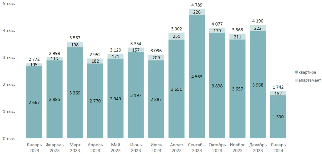 В январе 2024 года было заключено 1,7 тыс. сделок ДДУ, что на 58% меньше, чем в прошлом месяце. В сравнении с январем прошлого года спрос сократился на 37,2%. Это объясняется в первую очередь вступлением в силу новых условий по ипотеке. Также сокращение уровня спроса может быть обусловлено фактором сезонности, так как в январе было заключено 358 не ипотечных ДДУ, что на 26,5% меньше, чем в декабре 2023 года (487 ДДУ).