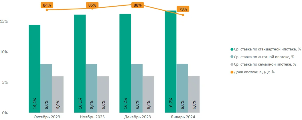 Вступление новых условий по ипотеке отразилось и на доле ипотечных сделок. За месяц доля сделок с ипотечным обременением сократилась на 9 п.п. и составила 79%. Средняя ставка по стандартной ипотеке в январе достигла 16,7%.