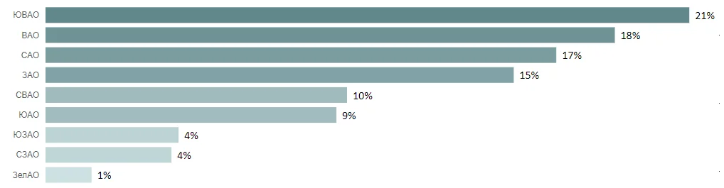 В разрезе округов наибольшее количество сделок отмечено в ЮВАО – 21% рынка, при том, что ЮВАО занимает 18,8% доли предложения рынка массового сегмента. Существенная динамика отмечена в ВАО, где за месяц доля спроса выросла на 5 п.п. В СВАО и САО доля спроса сократилась на 4 п.п. и 3 п.п., соответственно.