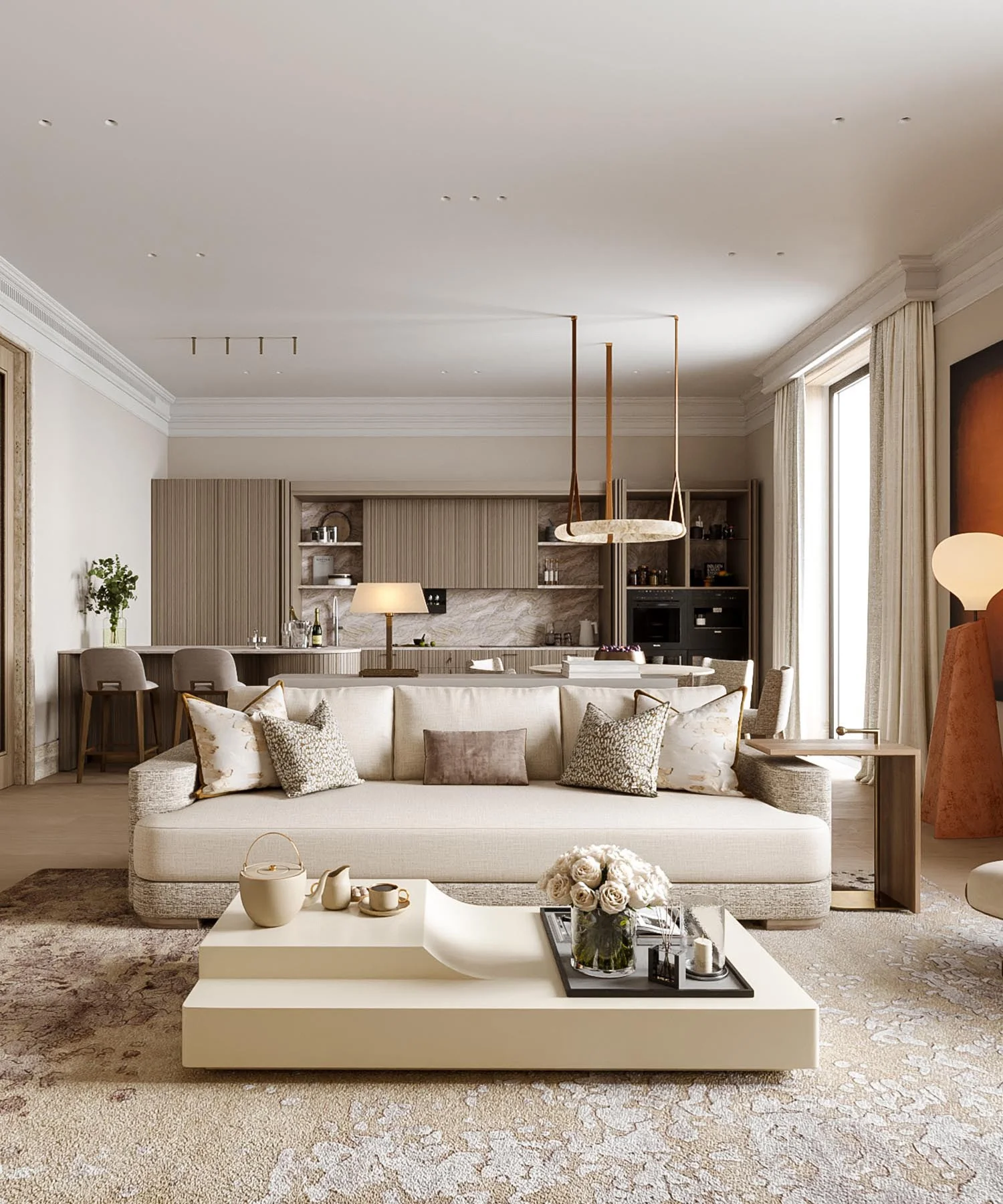 Этот жилой комплекс создан в партнерстве с Giorgio Armani. Интерьеры разработаны студией Armani/Casa Interior Design под руководством самого Джорджио Армани. В оформлении используются натуральный камень светло-серого цвета, дубовый паркет, мрамор Nero Marquino и Lasa, а также обои Armani/Casa Louvre. Панорамные окна и французские балконы добавляют элегантности и света в помещения. В интерьерах отражен современный тренд «тихая роскошь», когда во внешне минималистичном дизайне усматриваются дорогие отделочные материалы, элементы декора и освещения.
