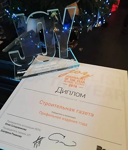 В Москве прошла ежегодная церемония награждения лауреатов премии JOY (Journalist of the Year) для независимых журналистов и СМИ, пишущих о недвижимости. Всего в этот вечер своих владельцев обрели 23 статуэтки. Журналистские работы оценивались в десяти основных категориях. В номинации «Профильное издание года» третий год подряд победу одержала «Строительная газета». Нынешний успех «СГ» во многом связан с тем, что издание вошло в десятку самых цитируемых СМИ рынка недвижимости по версии системы «Медиалогия», заняв 6-е место по итогам III квартала текущего года. Кроме того, в 2018 году «Стройгазета» успешно запустила серию профильных круглых столов, в которых приняли участие более 200 журналистов, экспертов и участников рынка.