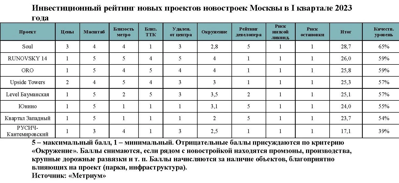 На основе анализа уровня цен, транспортной доступности, локации, надежности застройщика и других критериев эксперты компании «Метриум» определили лучшие новостройки для инвестиций среди новых проектов, которые вышли на рынок в I квартале 2023 года и рассказали о них «Стройгазете». По каждому критерию инвестиционной привлекательности проект получил балл, после чего всем новинкам рынка был присвоен рейтинг (подробное описание методики см. ниже).