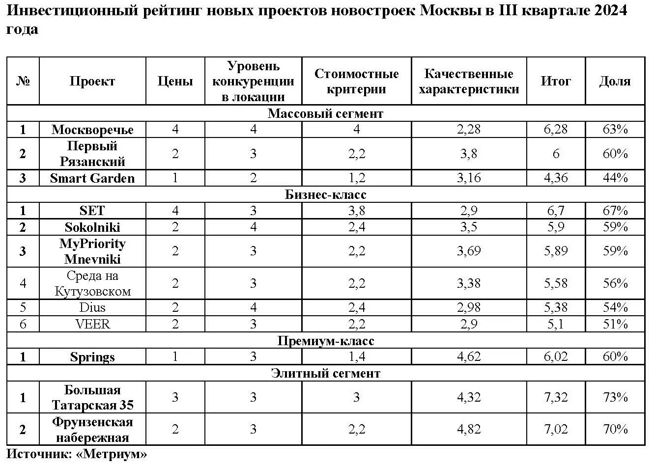 В III квартале 2024 года на рынке новостроек Москвы начались открытые продажи 12 проектов. Эксперты «Метриум» составили рейтинг наиболее перспективных из них с точки зрения инвестиционной привлекательности. Общие черты большинства новинок – стартовые цены без дисконта относительно рынка, квартальная застройка, развитая инфраструктура. Средняя цена квадратного метра в этих проектах составляет 1,1 млн рублей: в массовом сегменте – 300,2 тыс. рублей, в бизнес-классе – 450 тыс. рублей, в премиум-классе – 1 млн рублей, в элитном сегменте – 2,5 млн рублей.