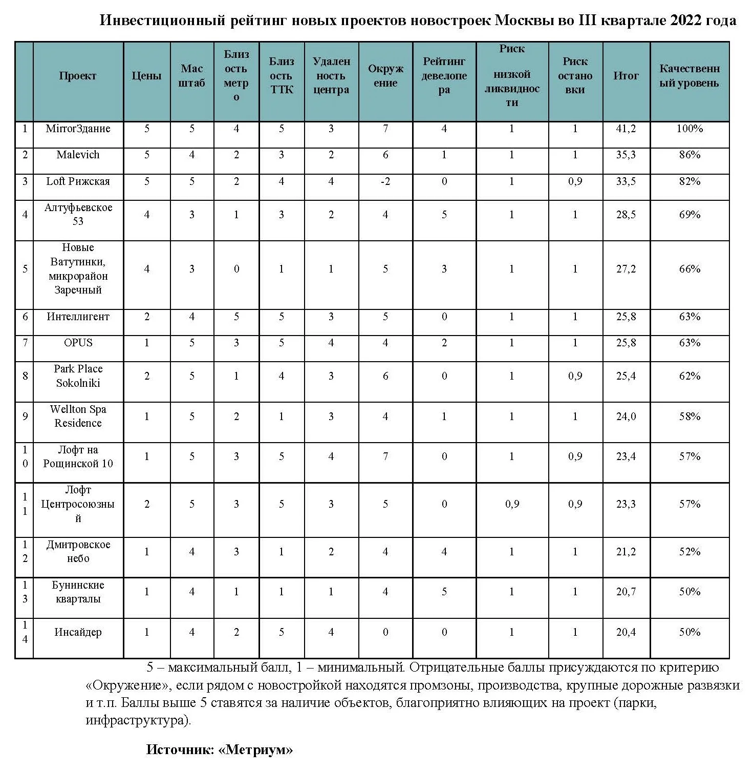 Бизнес-класс стал самым привлекательным сегментом московского рынка новостроек для инвестиций в III квартале 2022 года. На основе анализа уровня цен, транспортной доступности, локации, надежности застройщика и других критериев эксперты компании «Метриум» определили лучшие новостройки для вложения денежных средств среди новых проектов, которые вышли на рынок в III квартале 2022 года, и рассказали о них «Стройгазете». По каждому критерию инвестиционной привлекательности проект получил балл (от 1 до 5), после чего всем новинкам рынка был присвоен рейтинг.