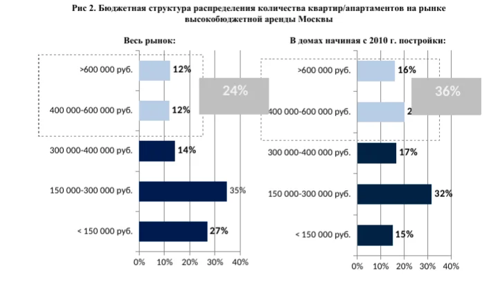 Под рынком высокобюджетной аренды квартир/апартаментов мы понимаем сегмент, где представлены все предложения со ставками аренды выше 1000 долларов США или 65 тыс. рублей за объект/месяц (по текущему курсу). Так, наиболее дорогие квартиры в бюджетном диапазоне от 400 тыс. рублей за объект/месяц занимают сегодня 24% из числа всех экспонируемых лотов в данном сегменте. Для сравнения: доля квартир в аналогичном диапазоне ставок, но расположенных в новых домах, составляет более 1/3 объема предложения (36% рынка).