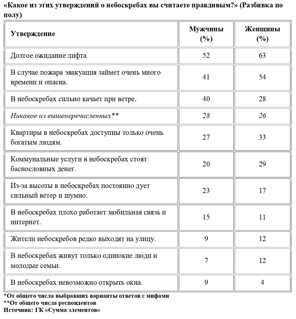 Миф о том, что в небоскребах сильно качает, также более распространен среди мужчин (40%), чем среди женщин (27%). Зато женщины чаще мужчин верят, что квартиры в небоскребах доступны только очень богатым (32% против 27%) и что коммунальные услуги там слишком дороги (30% против 20%).