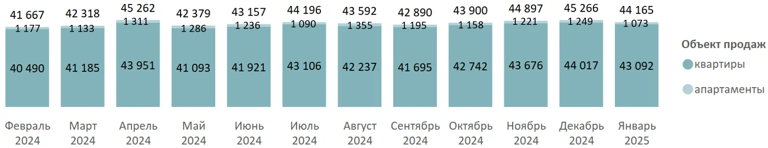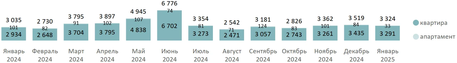 В январе 2025 года на рынке новостроек Московской области было зарегистрировано 3,3 тыс. ДДУ (-5,5% за месяц, +9,5% за год), с апартаментами было зарегистрировано 33 сделки, с квартирами – 3,3 тыс.