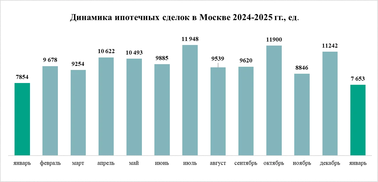 На ипотечном рынке в январе 2025 было зарегистрировано 7,7 тыс. кредитных сделок, что на 3% меньше, чем в январе 2024 года (7,9 тыс. соглашений), и на 32% меньше, чем в декабре 2024 года, когда количество соглашений между банками и заемщиками составило 11,2 тыс. По уровню активности покупателей январь 2025 года уступил январю 2022 года (8,4 тыс. сделок) и январю 2024 года (7,9 тыс.), а все прочие сопоставимые периоды – превзошел.