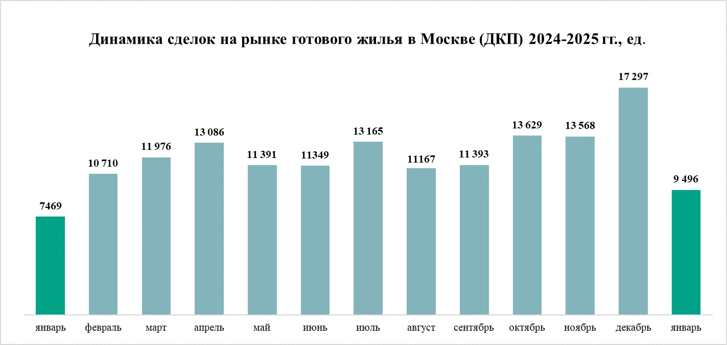 На рынке готового жилья (введенные в эксплуатацию новостройки и вторичное жилье) в январе 2025 года был отмечен заметный рост активности покупателей по сравнению с аналогичным периодом 2024 года. Было зарегистрировано 9,5 тыс. договоров купли-продажи, что на 27% больше, чем в январе 2024 года, когда было зафиксировано 7,5 тыс. сделок. Относительно декабря 2024, когда Росреестр Москвы зарегистрировал 17,3 тыс. соглашений, спрос уменьшился на 45%. В целом результаты января 2025 года оказались сравнительно высокими. В первый месяц текущего года заключили больше соглашений, чем в январе 2020 (8 тыс.), 2021 (7,6 тыс.), 2022 (9,3 тыс.), 2023 (7,7 тыс.) и 2024 (7,5 тыс.), но меньше, чем в январе 2019 года (9,9 тыс.).