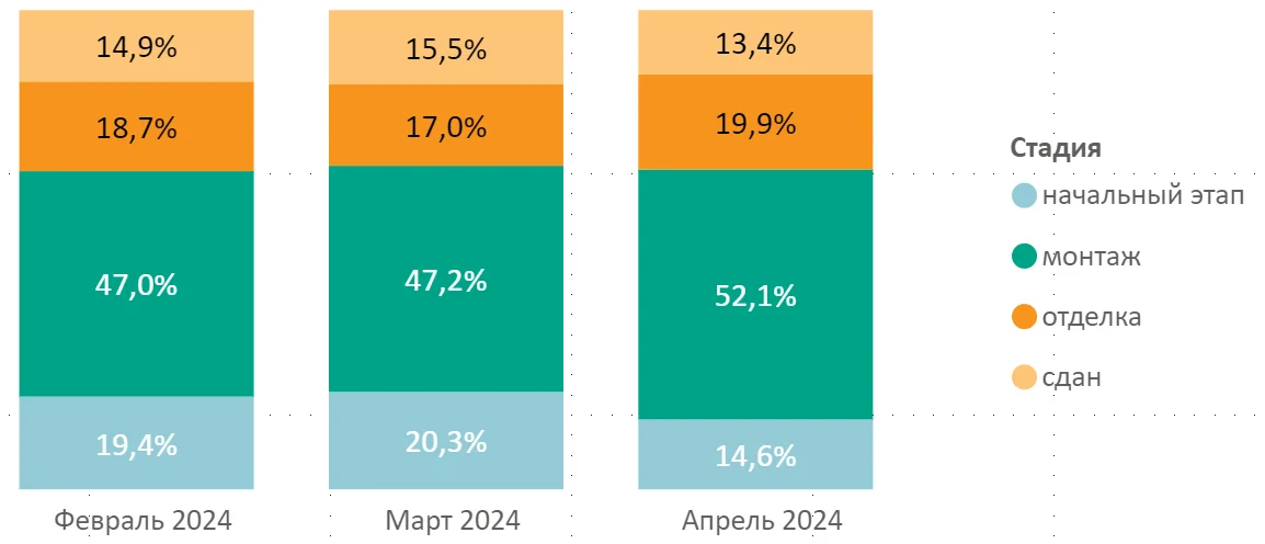 За месяц доля предложений в корпусах на этапе монтажа этажей выросла на 4,9 п.п. и составила 52,1%. В апреле монтаж этажей начался в корпусах таких проектов как «Квартал героев», «Горки Парк», «Мытищи Парк», «Егорово Парк», Riga Hills и другие.