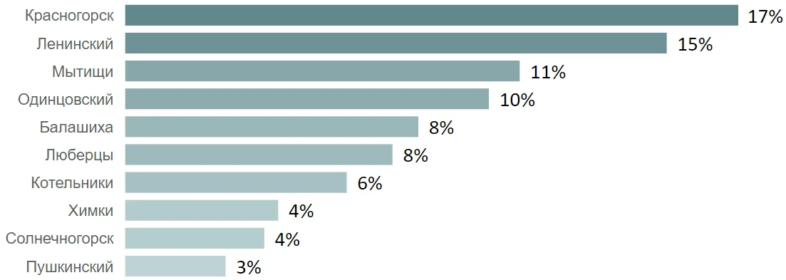 Максимальное число сделок в Московской области было заключено в Красногорске (17%, без изменений за месяц). В Ленинском проспекте было заключено 15% сделок (-1 п.п. за месяц).