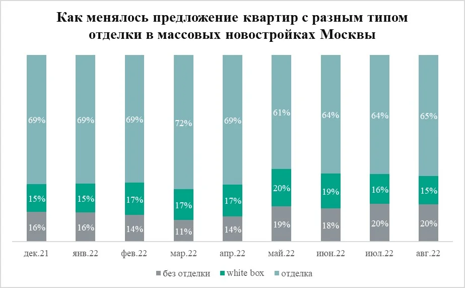 В августе 2022 года на рынке новостроек эконом- и комфорт-класса в Москве застройщики продавали 19,4 тыс. квартир. В большинстве из них (12,6 тыс.) девелоперы предусмотрели полную отделку. Помимо этого, в 3 тыс. квартир была запланирована предчистовая отделка (white box). Без отделки застройщики предлагали приобрести 3,8 тыс. квартир.