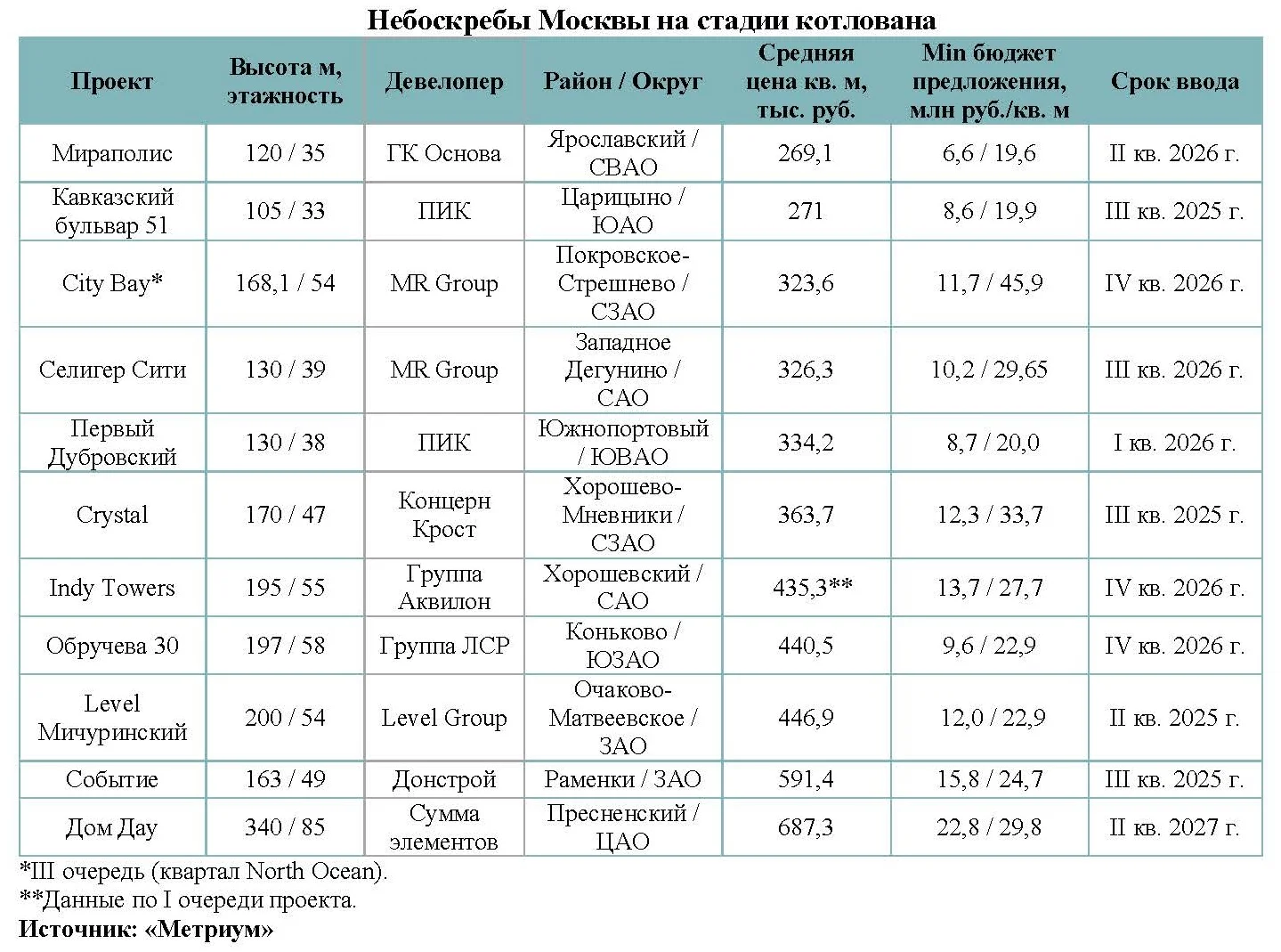 Самый доступный проект с небоскребами на котловане – апарт-комплекс бизнес-класса «Мираполис» от ГК «Основа». В его состав входят четыре корпуса высотой до 120 метров. «Мираполис» расположен на границе Ярославского района и Ростокино (СВАО), в 500 м от «Лосиного острова». Внутренняя инфраструктура проекта включает торговый центр, рестораны, магазины, фитнес-клуб с бассейном и SPA. В двухуровневом дворе предусмотрены амфитеатр, сад для медитации, прогулочная аллея, на крыше стилобата – смотровая площадка и зона отдыха. Срок ввода «Мираполиса» – II квартал 2026 года. Средняя цена кв. метра в проекте – 269,1 тыс. рублей.