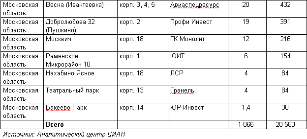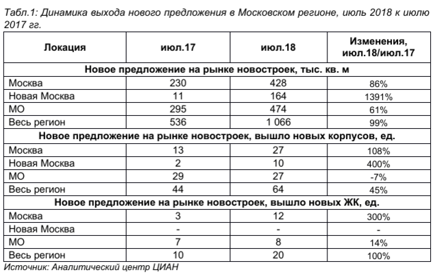 По итогам июля 2018 года на рынок новостроек Московского региона девелоперы вывели рекордное количество новых корпусов за последние 1,5 года — 64 ед. (+31% по сравнению с июнем 2018 года и в 2 раза больше, чем год назад), это более миллиона квадратных метров. Как отмечают аналитики ЦИАН, такой рост связан с тем, что в апреле–июне девелоперы получили рекордно большое число разрешений на строительство (срок действия каждого такого документа ограничен, поэтому рост числа новых проектов в ближайшие месяцы продолжится).