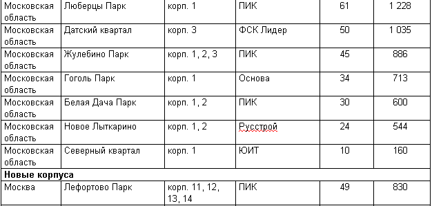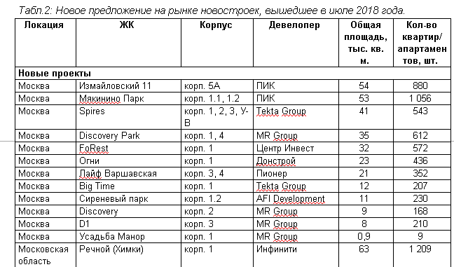 В июле 2018 года девелоперы открыли продажи в 20 новых проектах на территории Московского региона, по сравнению с аналогичным периодом прошлого года показатель вырос в 2 раза. В Московской области по количеству новых проектов лидирует город Люберцы — здесь стартовали проекты «Жулебино Парк», «Люберцы Парк» от компании ПИК и ЖК «Гоголь Парк», который возводит ГК «Основа». На территории Москвы наибольшее количество новых проектов вывели в экспозицию в ЗАО. Здесь стартовали ЖК «Огни» («Донстрой»), ЖК «Мякинино парк» («ПИК»), ЖК FoRest («Центр Инвест») и ЖК Spires (Tekta Group).