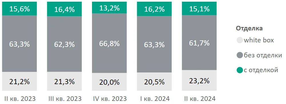 За I полугодие 2024 года вырос объем предложения с чистовой отделкой (15,1%, +1,9 п.п. за полугодие) и white box (23,2%, +3,2 п.п. за полугодие). Доля предложения без отделки сократилась (61,7%, -5,1 п.п. за полугодие).