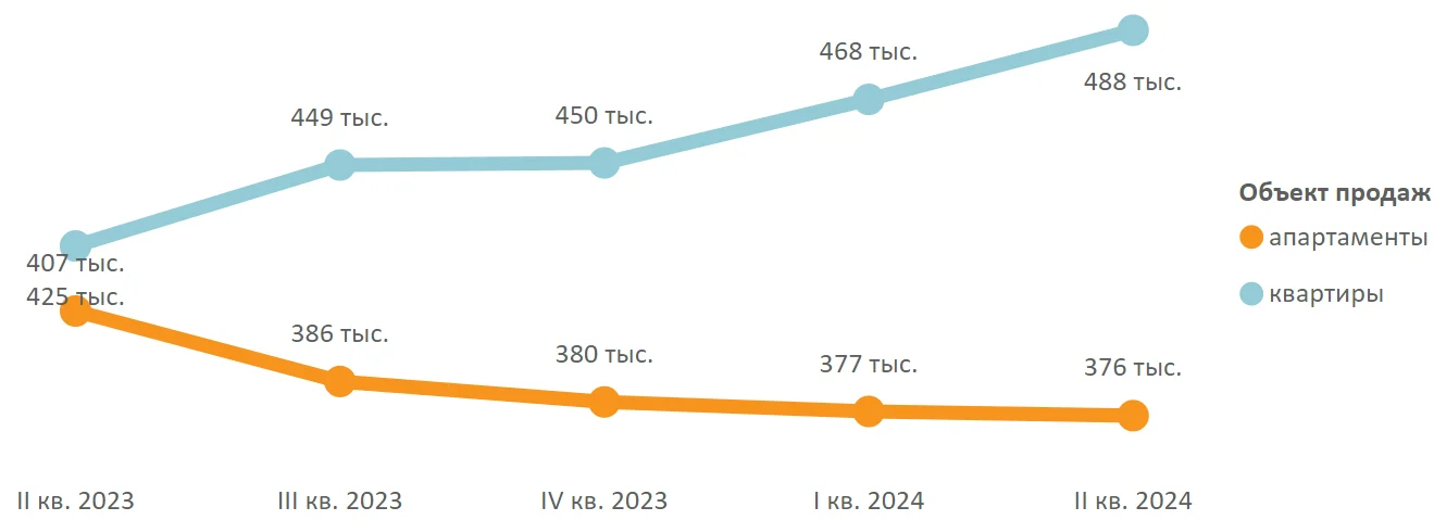 В связи с запретом на проектирование жилых квартир менее 28 кв. м выросла стоимость предложения данного формата. В начале 2024 года доля квартир и апартаментов в бюджете до 15 млн рублей составляла 20%. За полгода доля таких предложений сократилась на 5 п.п. и составила 15%.